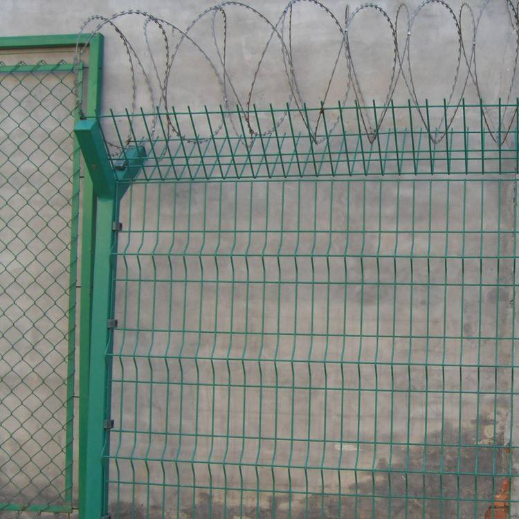 機場鋼筋圍界具有美觀實用,便于運輸和安裝的特點,而且還具有很強的地形適應性,可以根據地面的起伏調整上下柱的連接位置,監獄隔離網的Y形鐵絲網由大直徑高強度合金鋼絲制成,具有防爬,防震,抗剪,抗震性能好的特點。