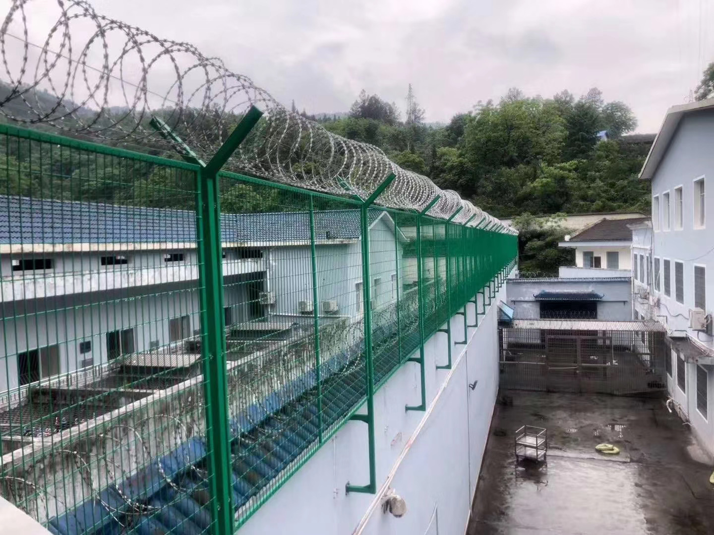 4、V型頂端安裝刀片刺網(wǎng),直徑采用50cm-60cm刀片刺網(wǎng)主要是由熱鍍鋅鋼板或不銹鋼薄板沖壓而成的,它擁有尖銳的刀片,高張力鍍鋅鋼絲或者不銹鋼絲做芯線組合而成的產(chǎn)品。內(nèi)側(cè)或頂離加裝輪腹形刀刺網(wǎng),形成一道高不可可攀、難以途越的隔離障礙。配臺(tái)高壓打擊電網(wǎng)、各種監(jiān)控報(bào)警設(shè)備確保監(jiān)監(jiān)獄安全萬無一失。