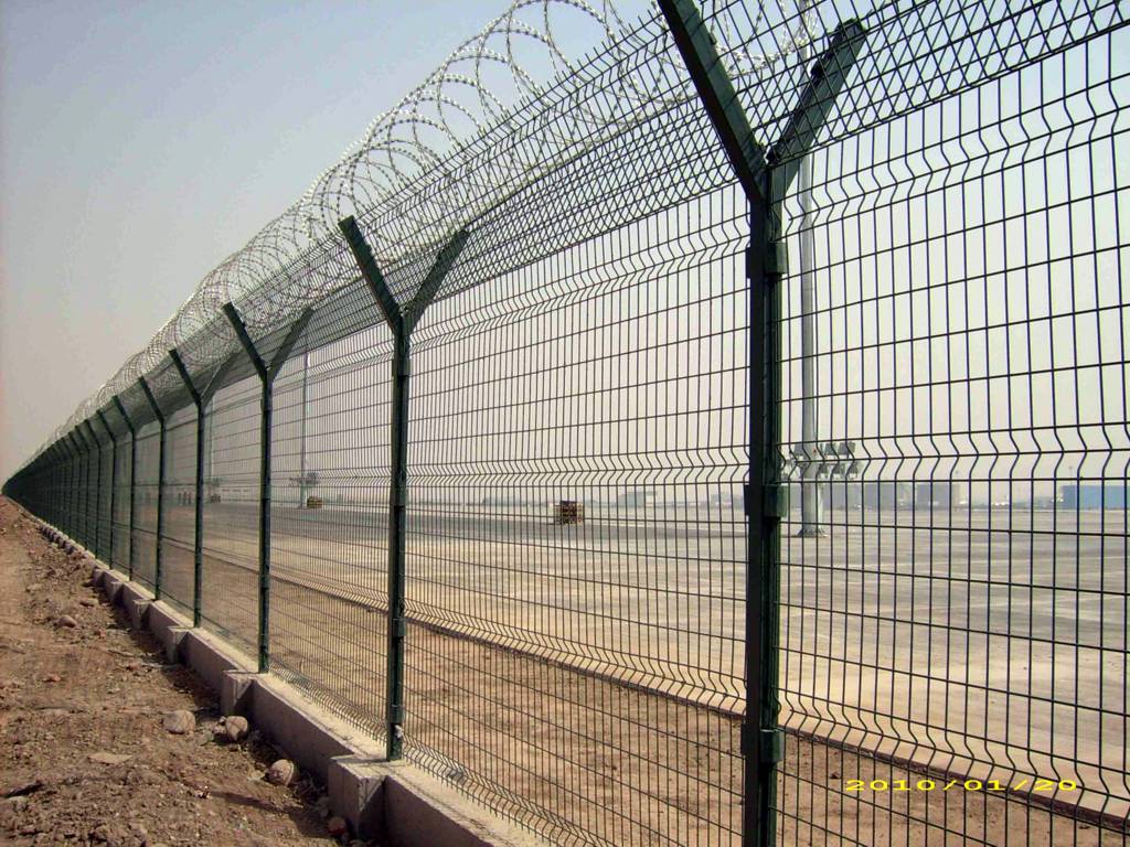 機場護欄網又稱作“Y型安全防御護網”,是由V型支架立柱加強型焊接片網,安全防盜連接件和熱鍍鋅刀片刺網組成強度和安全防御性級別很高。被廣泛應用在機場,軍事基地等高安全場所。