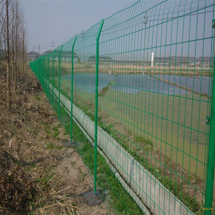 (4)雙邊護欄網:隔離網的頂端和兩邊都有十分鄰近的兩條邊絲,所以稱為雙邊絲護欄網。應用于鐵路線封閉式網、高速路封閉式網、廠區護欄、小區護欄、各種各樣體育場、工礦學校等等。