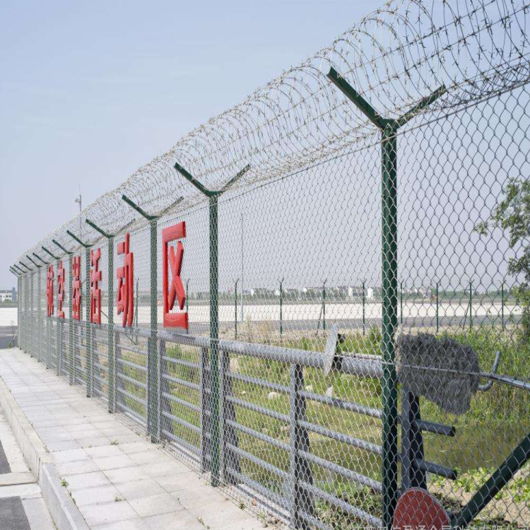 碼頭Y型柱鋼網墻是有效防止攀逃。直刺式刺網隔離帶,是用柱體和316不銹鋼刀刺網橫、縱、斜向交叉綁定成刺網隔離帶。