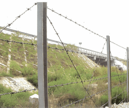 刺鐵絲防護(hù)網(wǎng)主要采用刺鐵絲和立柱組合使用,做護(hù)欄網(wǎng)使用,起到隔離防護(hù)的作用。刺繩也可配合護(hù)欄網(wǎng)使用,架在護(hù)欄的上方,多用在變電站,飛機場等地。
