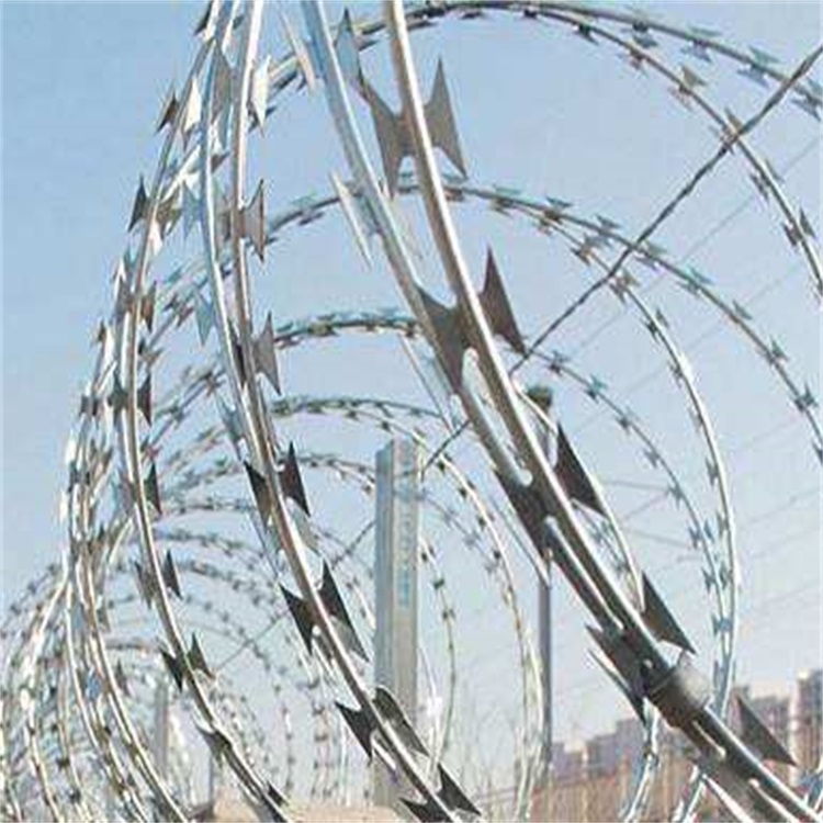 刀片刺繩一般安裝在圍墻或圍欄上安裝,刀片刺繩生產廠家生產的刀片刺繩采用鋼板(刀板)沖壓成型包附于熱鍍鋅鋼絲(芯線)之上,由銳利尖角鍍鋅鋼板或不銹鋼薄板做刀片,高張力鋼絲做芯線組合而成的。