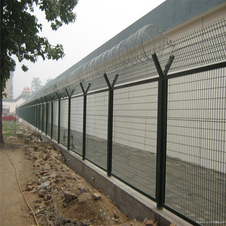 監獄護欄網主要是采用高強度的刀片刺繩與邊框防護網的結合,由V型支架立拄,加強型焊接片網,安全防盜連接件組成而成的。