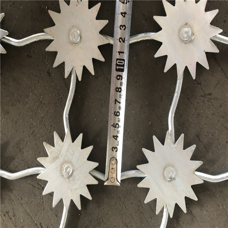 沖壓刺片隔離網又稱太陽花刺隔離網:是用氬弧焊將梅花形刺片焊接在美格網的節點上,形成刺形保護,有效的防止了手握腳攀,為此該網開始在監獄或看守所使用。材質一般為不銹鋼材料,也有的采用熱鍍鋅、后熱鍍鋅或者浸塑防腐處理。沖壓刺片隔離網主要用在監獄隔離網,機場圍界、主要用于軍事設施、電力配電站、邊防線、邊防哨所的高安全圍網。還可用于廠區、倉庫隔離網、交通、通信站、垃圾場、小區防護、學校、工廠、農場等地的圈禁防護。