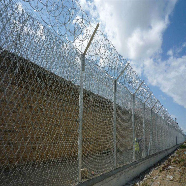 監獄刺繩護欄網一般還會被稱為Y型安全隔離防護網,是由Y型支架立柱,加強型焊接片刺繩網片,安全防盜銜接件和熱鍍高鋅刀片刺繩組成強度和安全防護性等級很高的護欄網。