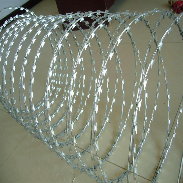 鐵路刀片刺絲滾籠一般具有以下幾點(diǎn):將滾籠刀片上的帶刺鋼絲繩繞兩個(gè)相鄰的圓后,用帶刀片刺絲銜接夾在120度處,開口后構(gòu)成腹網(wǎng),閉合后的刀片刺絲直徑為50cm,開口后每個(gè)十字環(huán)裝置間隔一般為20cm,直徑不小于45cm。