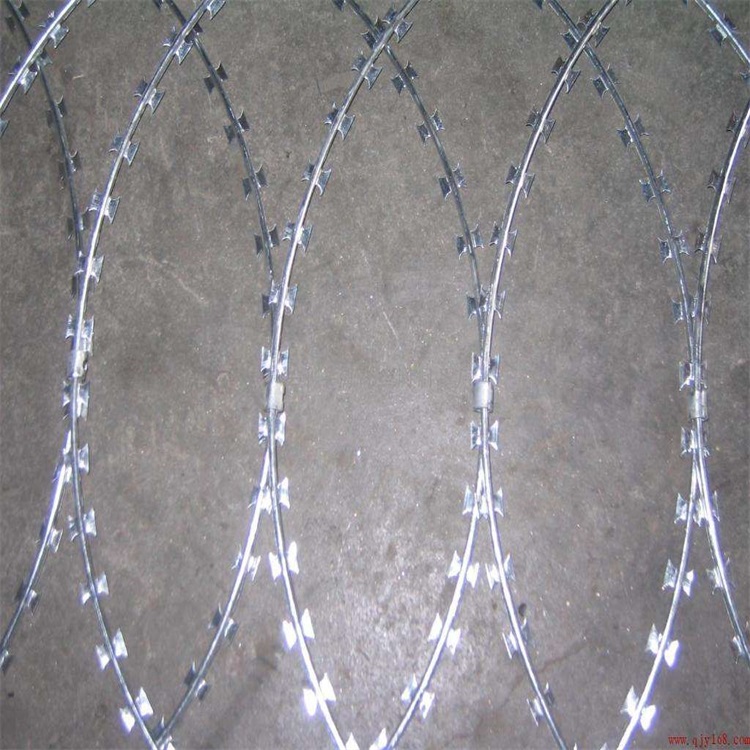 籬笆型刀片刺繩  籬笆型刀片刺網是一種刀片刺網做成籬笆型的防護網,刀片實用且外形美觀,主要用于圍欄、門窗的防護和軍事防御等長度、直徑可依客戶要求制作。