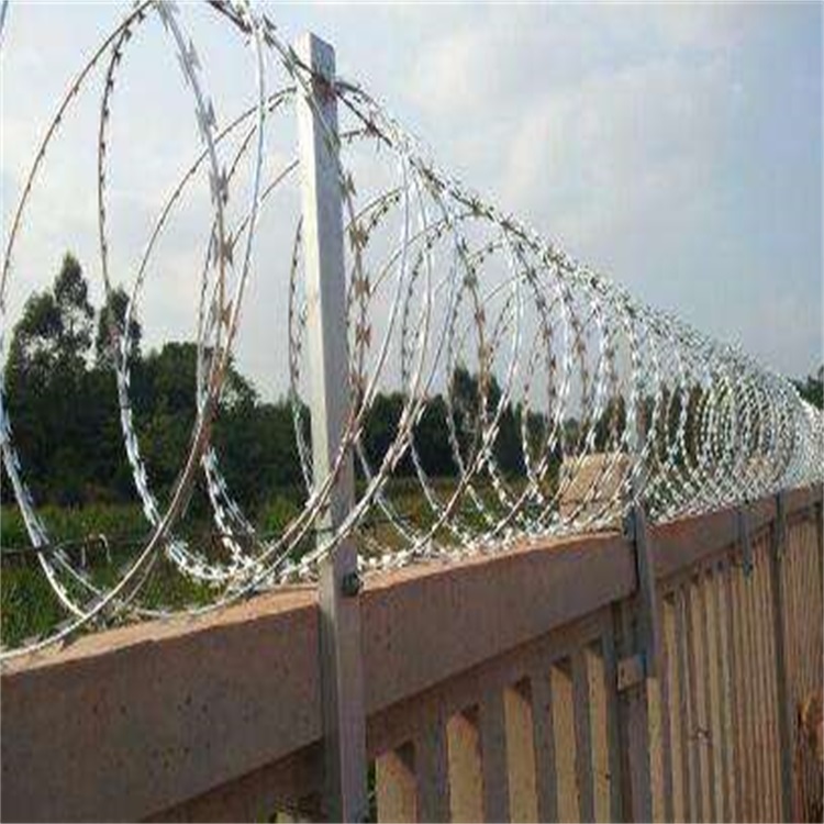 鋁包鋼刀片刺繩也叫生銹刀片刺繩是由鋁包鋼絲為原料生產(chǎn)的一種新興刀片刺繩,其產(chǎn)品較一般刀片刺繩來說質(zhì)量輕、強度高、美觀、耐用。 主線采用250絲的純鋼絲,外面再包上50絲的鋁,這樣可以防止生銹。鋁的比重是鐵的三分之一左右,鋁包鋼刀片刺繩是純鋁絲制作的,刺繩的切口也不會因此而生銹的,這樣解決了刀片刺繩工序中的一大難題,雖說鋁的價格高高在上但是比重低,單位米數(shù)會長,合成本比普通熱鍍鋅差不多少的。以后大家需要在環(huán)境十分惡劣的情況下又有了一種新的選擇。