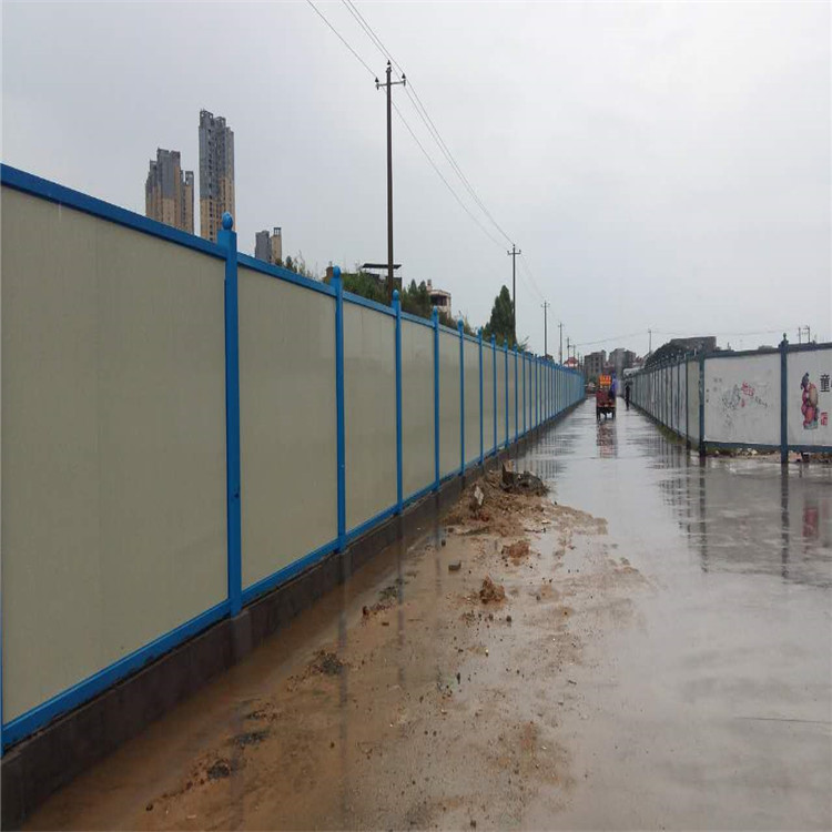 道路施工圍擋全體要求:路途施工安全圍擋現(xiàn)場四周應(yīng)連續(xù)設(shè)置不低于2.5米的圍擋,圍擋選用兩層0.58mm鋼板夾5cm厚芯的彩鋼板,彩鋼板高度為2.2米,外側(cè)藍(lán)色內(nèi)側(cè)乳白色。
