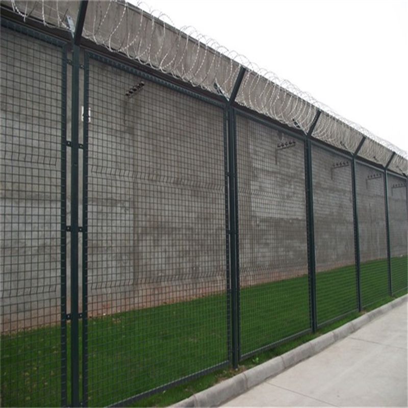 看守所鋼網墻又稱監獄護欄網或監獄隔離柵,主要是采用高強度的刀片刺網與普通防護網的結合,由V型支架立拄,加強型焊接片網,安全防盜連接件和刀片刺網組成.刀片刺網是一種新型防護網,由銳利尖角鍍鋅鋼板或不銹鋼薄板做刀片,鋼絲做芯線組合而成的防護器材. 監獄防護網刀片刺網具有嚇阻、防翻越等效果,材質堅硬,高強度,高張力,造型設計獨特,不宜觸摸,因而能達到極好的防護隔離效果.監獄護欄網還具有施工簡便,經濟實用等優點. 材質:監獄防護網選用低碳鋼絲、鋁鎂合金絲編織及特點:編制焊接而成。監獄護欄網網格結構簡練、便于運輸、安裝不受地形起伏限制,特別是對于山地、坡地、多彎地帶適應性極強。該產品堅固耐用、價格中等偏低,適合大面積采用。