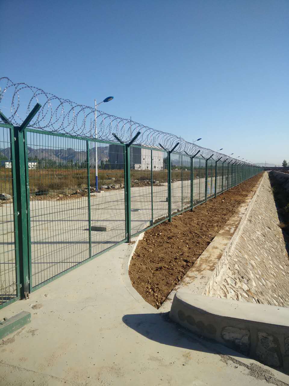 鋼筋網片一般為墨綠色,外形尺寸2*3m,網孔5*50cm,絲徑5mm,上端有V型支架用來固定刀刺滾籠,加強二次防護功能。飛機場鐵絲圍欄網立柱采用80*60*6mm矩形鋼管,預埋0.5m左右,整體進行熱鍍鋅和熱浸塑處理,防腐功能強、使用壽命長,是使用量廣泛的機場圍界樣式。
