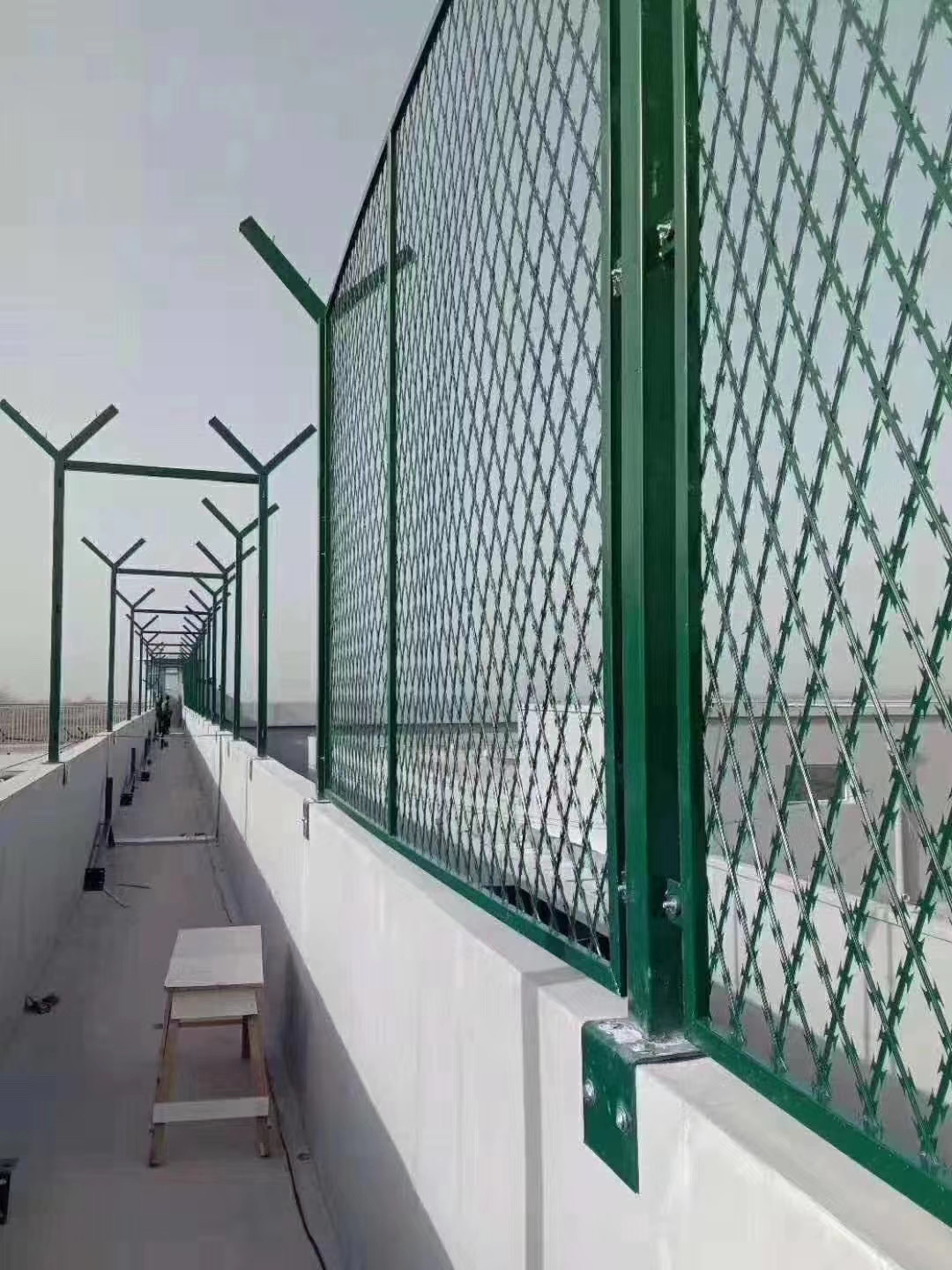 上面裝有刀片刺網(wǎng)(刺絲滾籠),蛇腹型刀片刺繩具有阻嚇防觸碰的效果,材質(zhì)堅硬、高張力、高強度.不易觸摸等能達到***好的隔離效果。