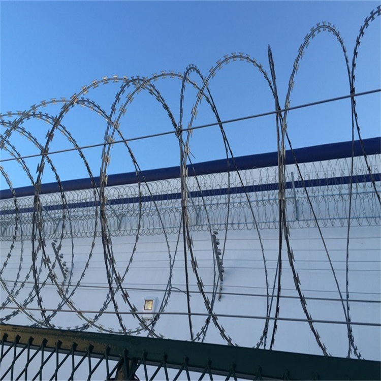 除了物理阻隔,蛇腹型刀刺網(wǎng)的另一個重要作用是提供心理威懾。其鋒利的刀片和規(guī)整中透著凌厲感的螺旋造型,在視覺上就能給人留下深刻的印象。當(dāng)它安裝在監(jiān)獄、軍事基地、邊境線或機場等高安全場所的圍墻頂端時,本身就在宣示著區(qū)域的警戒性。這種威懾力讓潛在闖入者在行動之前就會產(chǎn)生心理壓力,從而有效降低了安全風(fēng)險,實現(xiàn)了物理隔離與心理警示的雙重防護。