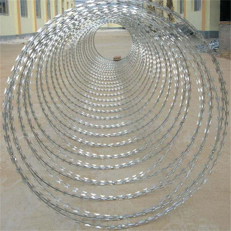 在工程應(yīng)用中,螺旋式刀刺繩的規(guī)格選擇需與安裝場(chǎng)景匹配。用于圍墻頂部的通常選用圈徑450毫米至600毫米的規(guī)格,刀片長(zhǎng)度28毫米,形成外展式螺旋圈,通過支架與墻體形成45度或60度夾角。地面平鋪式圍界則傾向圈徑800毫米以上的大規(guī)格,利用螺旋結(jié)構(gòu)的滾動(dòng)特性增加攀爬難度。刀片材質(zhì)方面,沿海或化工廠區(qū)域普遍采用304不銹鋼刀片配合鋅鋁鎂合金芯線,通過鹽霧測(cè)試驗(yàn)證其耐候性能;普通區(qū)域使用275克/平方米雙面鍍鋅層刀片即可滿足常規(guī)防護(hù)需求。