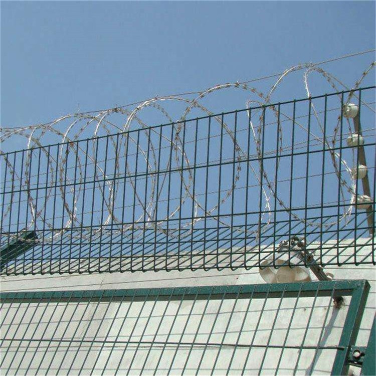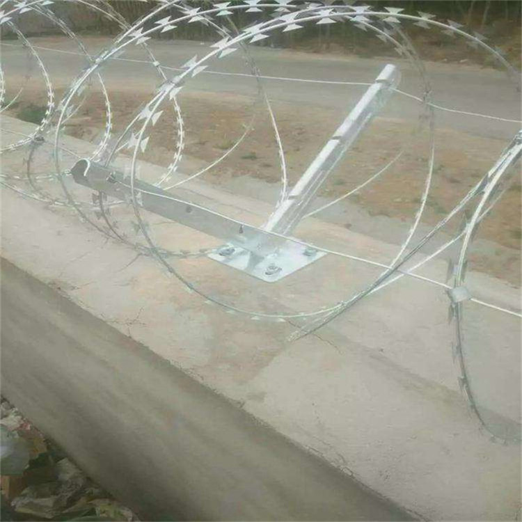 螺旋式刀刺網(wǎng)與護(hù)欄網(wǎng)片的固定通常采用專業(yè)的連接構(gòu)件。常見方式為使用高強(qiáng)度的鍍鋅卡扣或防脫落的金屬錨固件,沿護(hù)欄網(wǎng)片的橫向支撐梁或縱向框架,按照預(yù)設(shè)的間距將刀刺網(wǎng)螺旋主體牢固鎖緊。操作過程中需確保刀刺網(wǎng)展開均勻,每一圈之間的間距保持一致,從而形成連續(xù)的防護(hù)層。對(duì)于頂端帶有支架的護(hù)欄網(wǎng)片,則通過將刀刺網(wǎng)架設(shè)于Y型或L型支架之上,再以專用夾具進(jìn)行多點(diǎn)位固定,確保其受力均衡,不易發(fā)生位移或松脫。