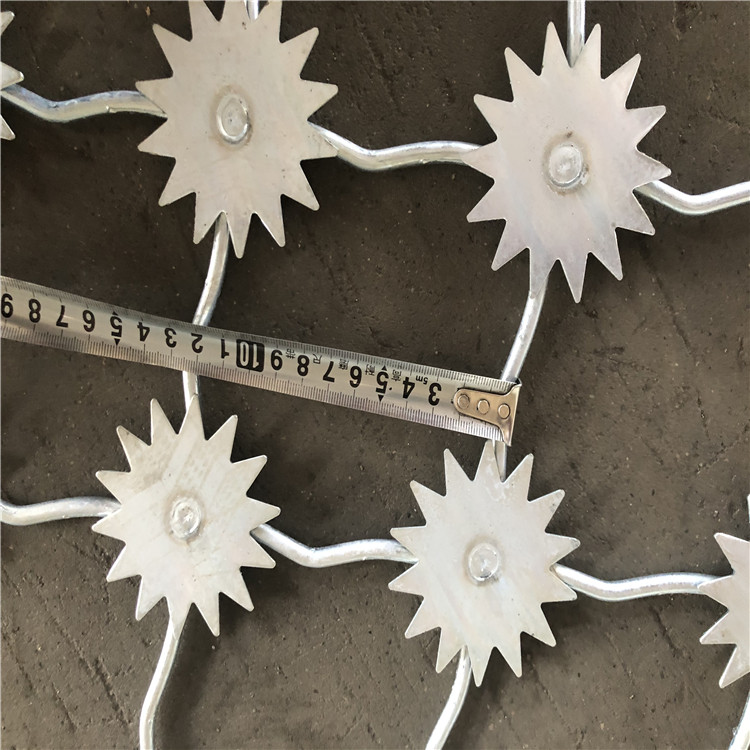 監(jiān)獄梅花刺片防護網(wǎng)又叫沖壓刺隔離網(wǎng)、太陽花刺片隔離網(wǎng),行業(yè)內(nèi)簡稱梅花刺網(wǎng)。其特點為堅固牢靠、防止攀爬等。監(jiān)獄梅花刺片防護網(wǎng)一般用于監(jiān)獄大門,探監(jiān)門,人員通道兩邊的隔離網(wǎng),由于其成本造價高,所以還沒有廣泛替代焊接式隔離網(wǎng)。